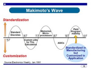 私(牧本)が提示するウェーブの周期は振り子に例えられる。標準化に振れているとき、それを推し進めているのは新しいデバイスや新しいアーキテクチャである。逆にカスタム化の方向に押しているのは、差別化、高性能化、省電力化である。カスタム化の方に振れているとき、それをカスタム化の方向に押しているのは、デザイン・オートメーションとデザイン方法論である。逆に、標準化の方向に押しているのは、市場に出るまでの時間の短縮化、開発費用、運転の効率化である。