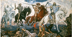[新約聖書黙示録6章1-8節では、小羊(キリスト)が第一の封印を解くと白い馬が、第二の封印を解くと真っ赤な馬が、第三の封印を解くと真っ黒な馬が、第四の封印を解くと蒼白い馬が現れる。4匹の馬は、戦争、内乱、死と飢餓、悪疫などを象徴する。図はスライドからで、Viktor Mikhailovich Vasnetsovの作。この4匹の馬の象徴は旧約聖書ゼカリヤ書6章の借用である。ここでは、4匹の馬は、「オーバーヘッド」「レイテンシ」「衝突」「スターべーション」であろう。]