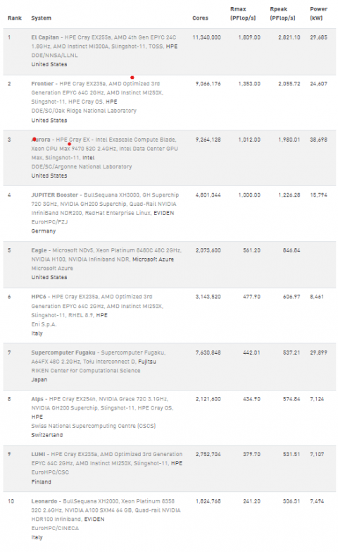 EuroHPC/JülichスーパーコンピューティングセンターのJUPITER Boosterシステムは、HPLベンチマークで1.000エクサフロップス/秒という新たな測定値を提出し、エクサスケール境界をわずかに超えた。El Capitan、Frontier、Auroraは依然としてTOP500をリードしている。これら3システムは全て米国エネルギー省(DOE)研究所に設置されている。