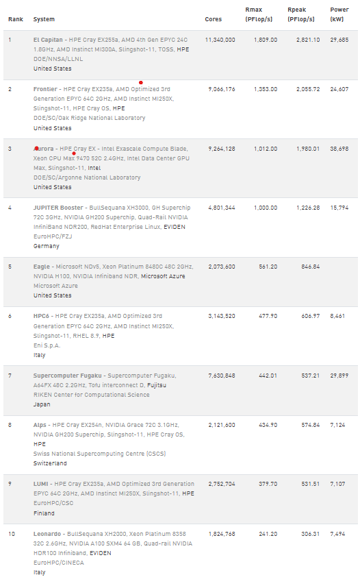 Auroraはインテルが構築したもので、HPE Cray EX – Intel Exascale Compute Bladeを基盤としている。これはインテルXeon CPU MaxシリーズプロセッサとインテルデータセンターGPU Maxシリーズアクセラレータを利用している。これらのコンポーネントはCrayのSlingshot-11ネットワーク・インターコネクトを介して通信する。Auroraはまた、HPL-MxPベンチマークで11.6エクサフロップス/秒を記録し2位につけており、AIとHPC性能のバランスが取れていることを示している。