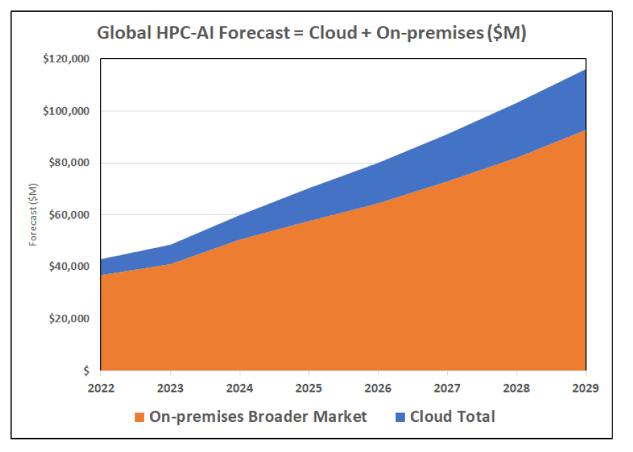 オンプレミス型HPCサーバへの支出は2029年までに500億ドルに達すると予測されている。非伝統的なサプライヤがその時点で市場の40%を占める見込みだ。ソフトウェアとサービスを含めた世界のHPC市場規模は2029年までに約1000億ドルに達すると予測され、クラウドが20%成長すれば1200億ドルになるとジョセフは予測した。