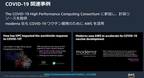 AWSの HPC 活用事例として、宮本氏は複数の事例を紹介。COVID-19関連では、「The COVID-19 High Performance Computing Consortium」にAWSが参加し計算リソースを提供している。製薬会社のModerna社もCOVID-19ワクチン開発のためAWSを活用中だ。