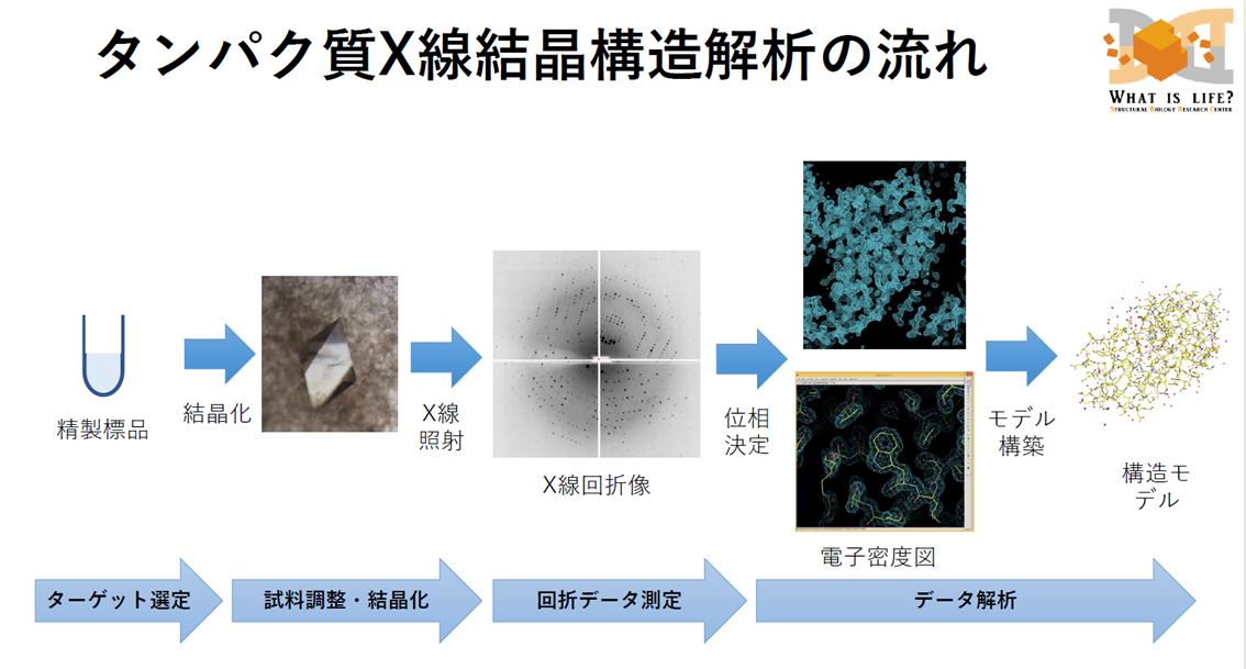 構造生物学者は「タンパク質の⽴体構造を解明し、その機能を理解すること」を目的に研究を行っている。タンパク質の機能理解が生命現象の理解につながり、タンパク質の機能を制御する薬剤設計や⼯業への応⽤が可能となる。