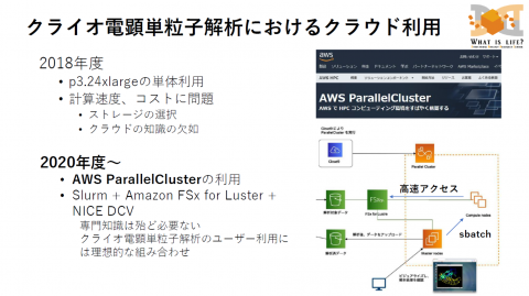 2020年度にAWSが提供するオープンソースのソフトウェアである「AWS ParallelCluster」を利⽤し再挑戦。「AWS ParallelCluster」ではクラウドの専門知識がほぼ必要なく、並列計算を行うための高性能な計算環境が構築可能だ。本サービスにより、クライオ電顕単粒⼦解析ユーザーにとって理想的なクラウド計算環境を構築。