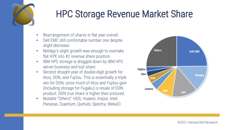また、DDN、Atos、富士通は2年連続で2桁の成長を遂げた。「DDNにとっては、富士通(富岳の一部)を通じた売上により、実に3つの勝利を収めたことになります。最も興味深いのはインテルで、インテルはOptaneやインテルが直接販売しているDAOS製品により、ストレージベンダーとしての地位を確立しています。」とSnellは語る。