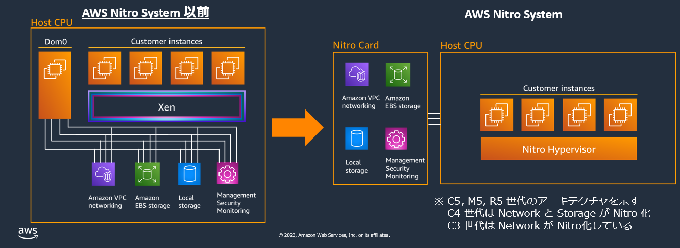AWS Nitro System 以前のAmazon EC2ではXen(ゼン)ベースの仮想化環境を採用していたのですが、ホストマシン上で仮想化を管理するためのソフトウェアが動作しており、貴重なホスト CPU のリソースが消費されてしまう、ネットワークやストレージの仮想化がソフトウェア処理されるためにレイテンシが大きくなりやすいといった問題がありました。